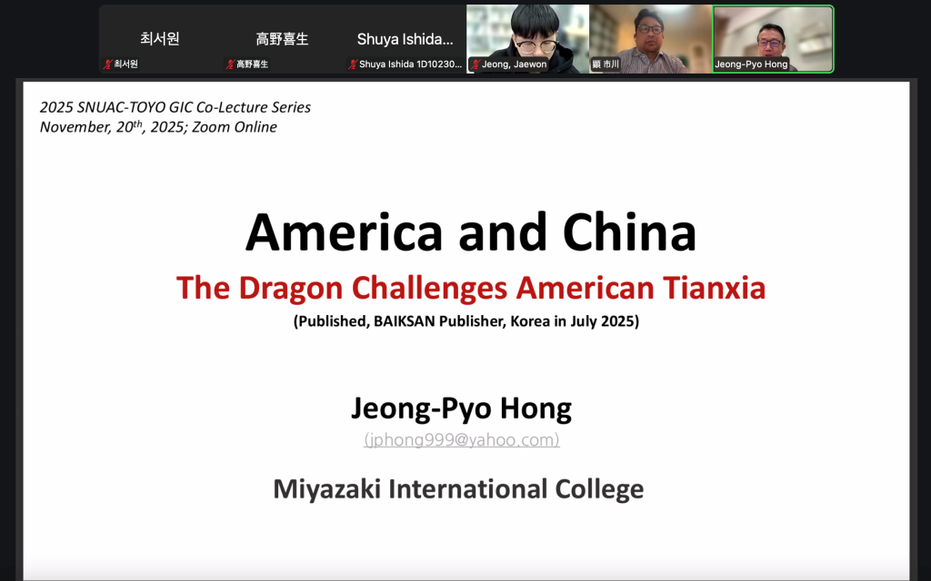 지난 11월 20일, 서울대학교 아시아연구소 시민사회프로그램과 TOYO GIC가 공동 주최한 SNUAC-TOYO GIC Co-Lecture Series 4차 강의에서는, 홍정표 前 일본 미야자키 대학(宮崎大学) 교수를 연사로 “America and China: The Dragon Challenges American Tianxia”을 주제로 강연을 진행하였다. “이번 특강은 홍정표 교수의 최근 발간한 책, [미국와 중국, 천하를 다투다] (백산서당, 2025) 내용 중 일부를 소개하는 자리이기도 했다.”