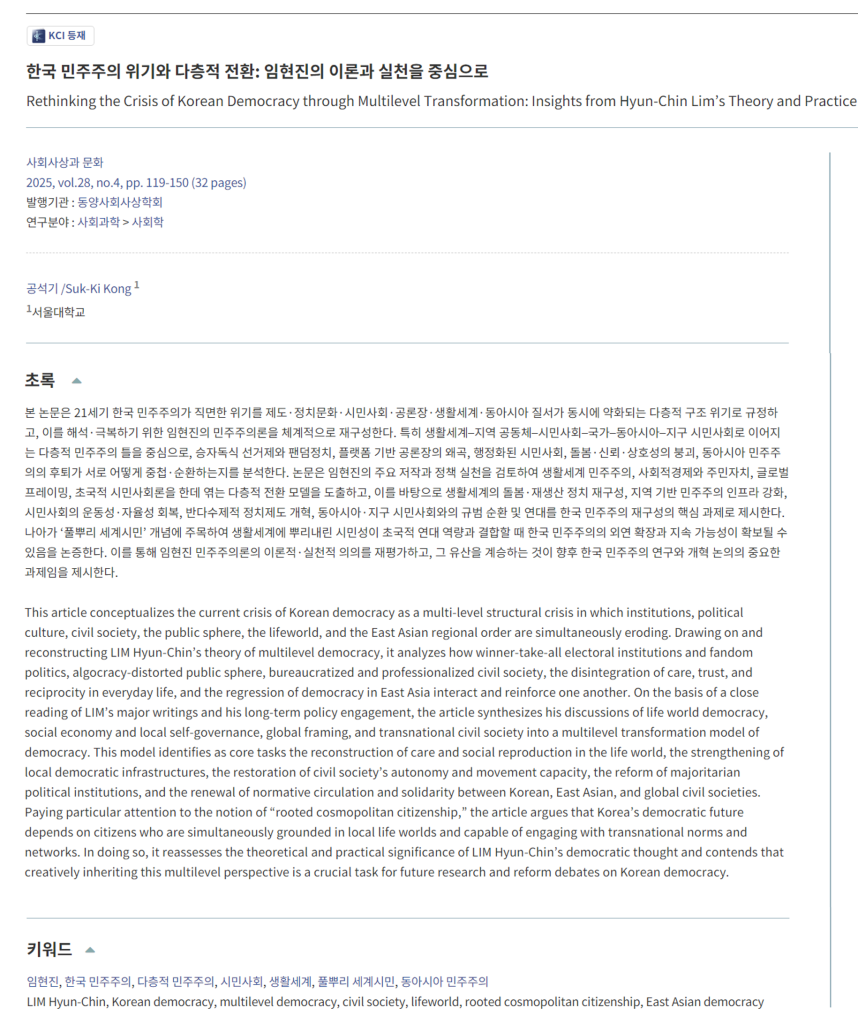 Suk-Ki Kong. (2025). Rethinking the Crisis of Korean Democracy through Multilevel Transformation: Insights from Hyun-Chin Lim’s Theory and Practice. Jonrnal of Social Thoughts and Culture, 28(4), 119-150.